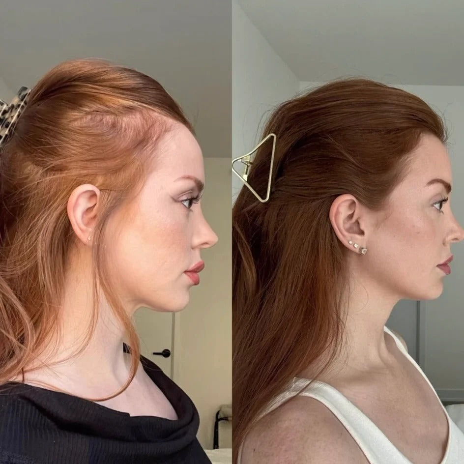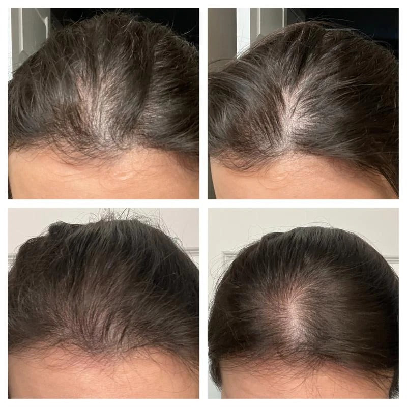 After: The hair looks fuller and thicker, with improved volume and shine. There are visible baby hairs and a healthier scalp, showcasing significant regrowth and vitality.